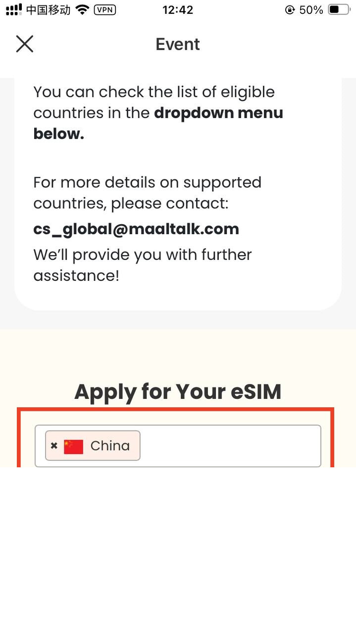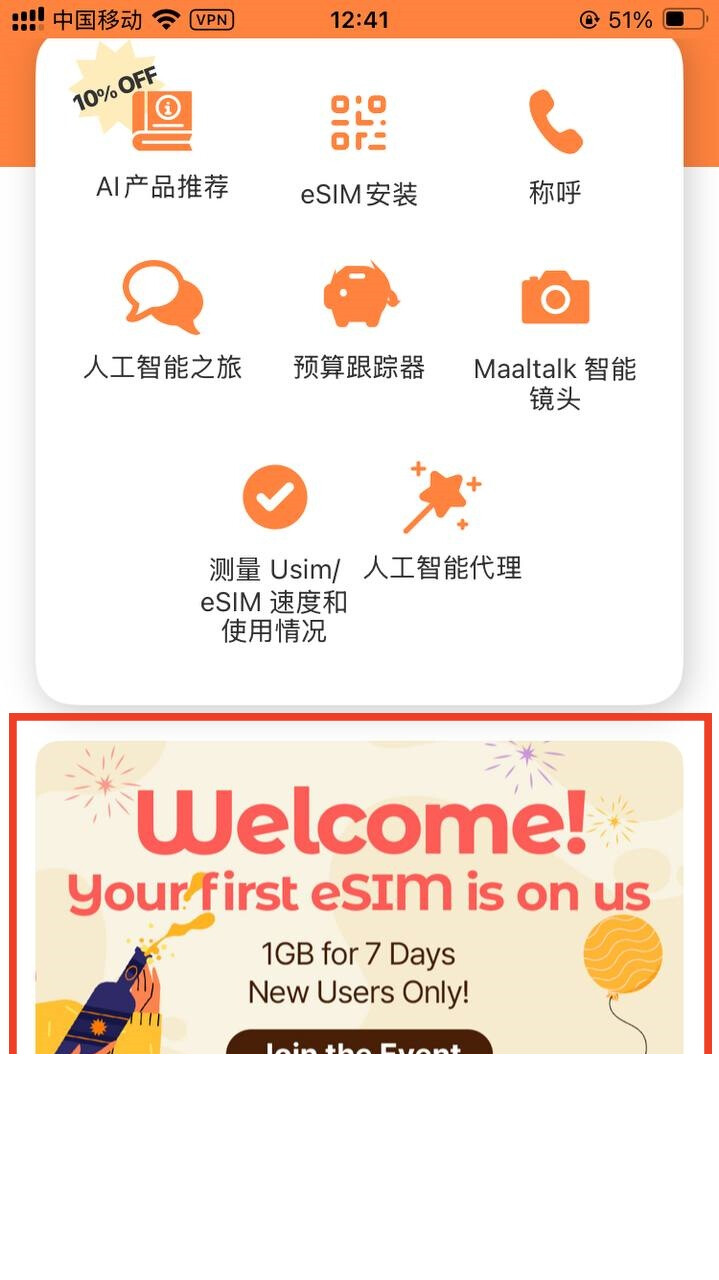 苹果或安卓的应用商店下载maaltalk,使用邮箱注册登录后,点击底部广告,进入选择目的地,点击:Apply Now,就会一个esim二维码到你邮箱